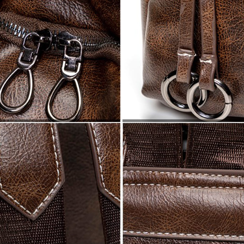 Soft synthetic leather with heavy duty zipper hardware. Detailed Double streamlined stitching. Full-lined coffee color fabric lining.