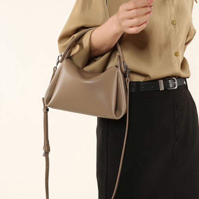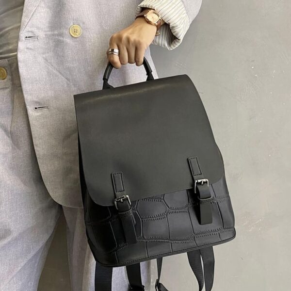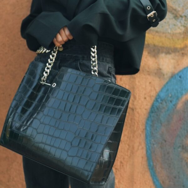 This tote bag is made of soft and durable PU leather. Fastening rivets on the handbag and on the shoulder strap make the bag more durable and chic.